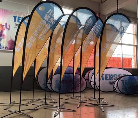 As the name suggests, the shape of the flag is like that of a feather. Like the straight flag, it is mostly straight along the pole side then curves at the top. The flag is also curved on a similar cut angle along the bottom, although there is no pole there. This flag offers a unique style that will catch people’s attention.